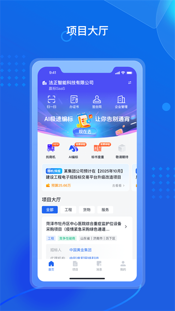 招采通官方版是法正智能科技有限公司推出的一款招标采购的移动办公软件,该软件拥有CA购买、电子签章、全流程扫码操作等功能。支持项目一键参与、在线审批缴费、开标动态实时追踪,结合AI商机分析与情报推送,助力企业高效实现数字化招采管理。有需要的朋友欢迎下载体验。