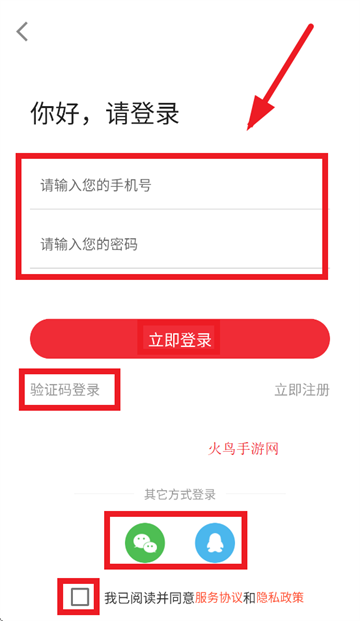 跳转至登录界面后,输入手机号,密码,勾选我已阅读并同意服务协议和隐私政策,点击立即登录即可,还可以使用验证码登录,微信,qq授权登录