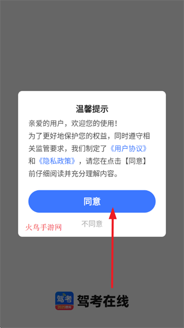 1、首先打开驾考在线app,阅读并同意《用户协议》和《隐私政策》;