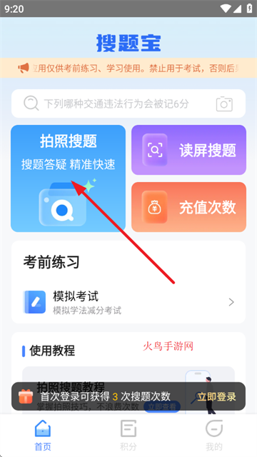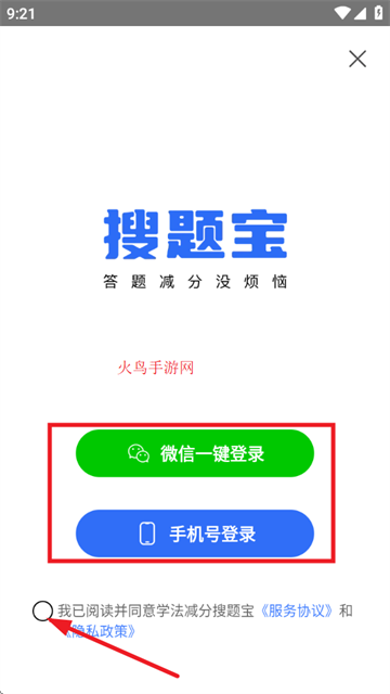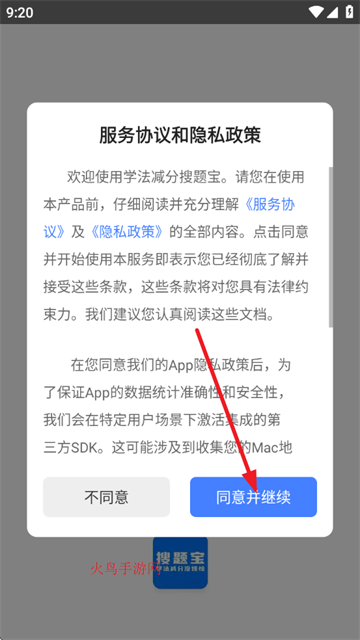 首先打开学法减分搜题宝app,阅读并同意“服务协议和隐私政策”;