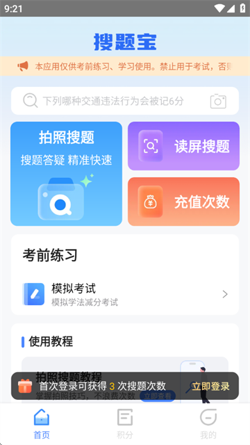 学法减分搜题宝app是深圳六分科技有限公司推出的一款专为车主打造的违规减分辅助软件,软件提供最新题库、拍照搜题及模拟考试功能,通过大数据分析帮助用户高效掌握考试要点,轻松完成学法减分流程。界面清晰简洁,有需要这款软件的朋友欢迎到本站下载体验!