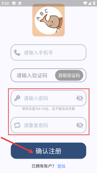 3、设置6到16位无空格密码并重复输入,点击【确认注册】。