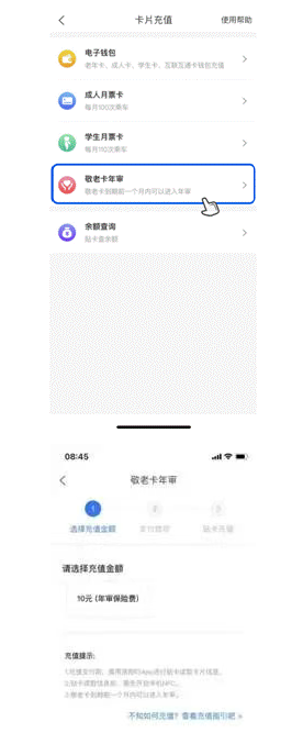 2.年审充值前必须先点击余额查询功能,将公交敬老卡贴于手机背面的NFC感应区,查验当前卡片是否支持在线充值。如提示不支持在线充值,请勿进行充值操作,使用原有渠道进行年审充值。