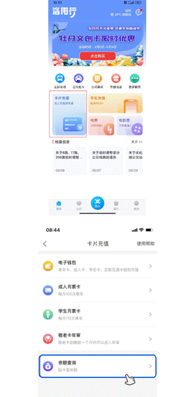 3.打开洛阳行APP,进入首页,点击“卡片充值”,进入卡片充值页面。