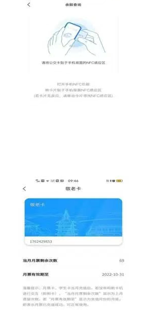 4.点击余额查询功能,将公交敬老卡贴于手机背面的NFC感应区,查验当前卡片是否可用。