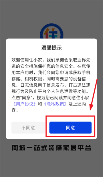 下载安装并打开住小家app,先同意温馨提示