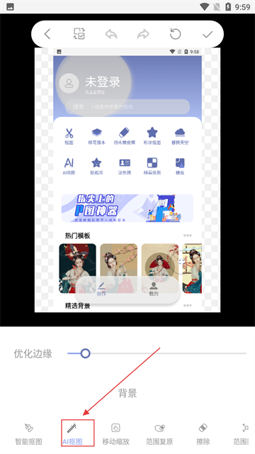 4、进入编辑界面,点底部【AI抠图】功能,借助AI智能抠取图像主体。
