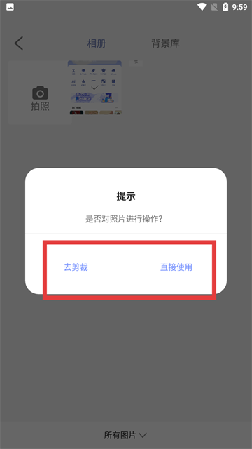 3、选图后弹出提示,按需点【去剪裁】编辑或【直接使用】进入下一步。