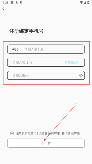 3、填手机号、验证码、密码,点【下一步】完成注册。