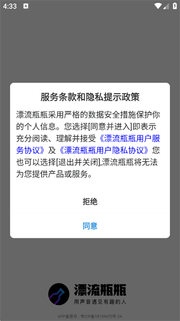 在下载漂流瓶瓶app,打开,同意服务条款