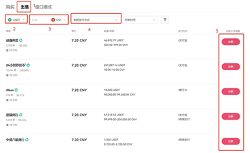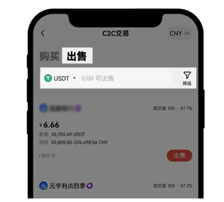 7、选择【出售】,选择【USDT】,选择【CNY】,选择【支付方式】,选择合适的买家进行出售,就完成人民币兑换。