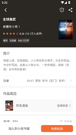 2、小说详情界面有作品简介,可以加入书架、分享小说