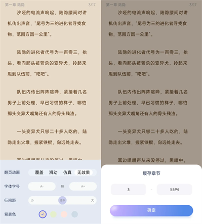 另外软件还支持设置字体、背景颜色、翻页方式和下载缓存小说。