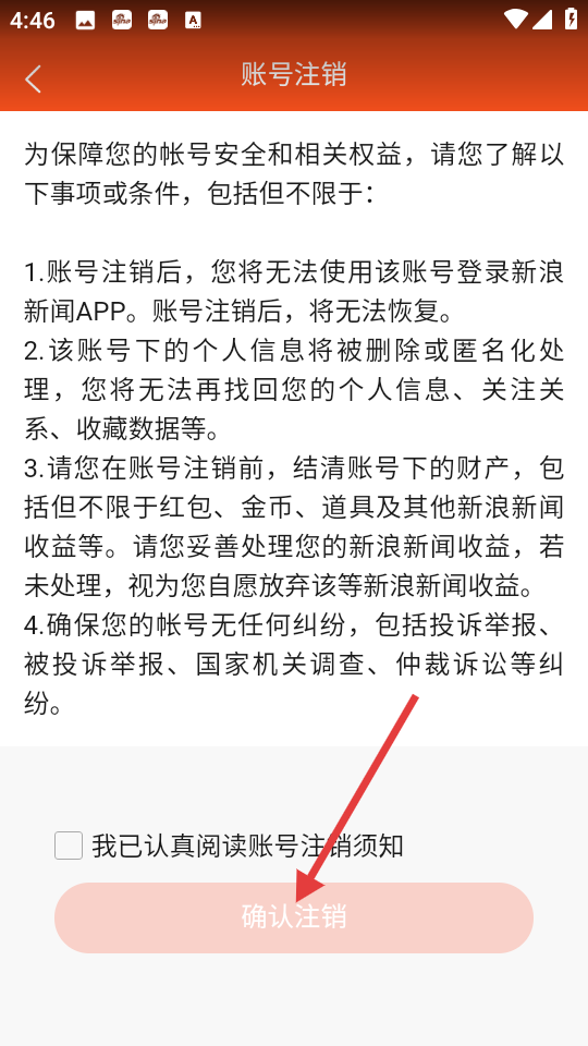 3、进入账号注销页面后仔细阅读页面上显示的账号注销须知,了解注销账号的后果,在确认自己已清楚相关事项后点击确认注销按钮,按照后续提示完成注销操作。
