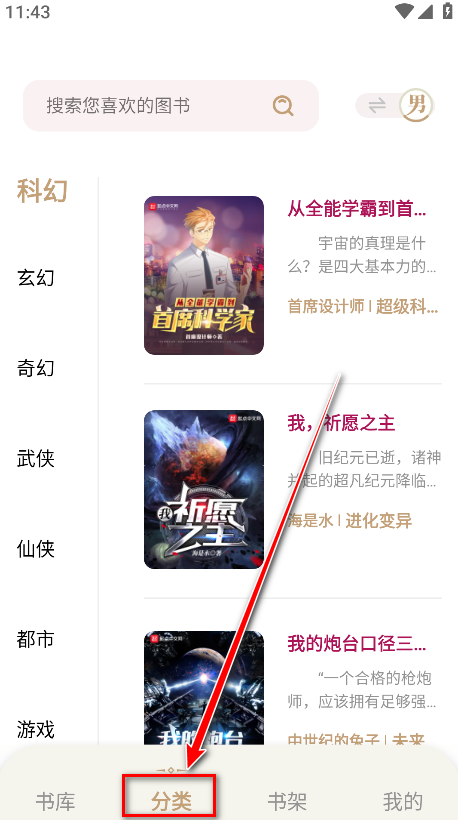 7.返回到主页面,点击下方的分类,可以看到左侧会显示科幻、玄幻、奇幻、武侠、都市等不同类型的小说资源,大家可以根据自己的阅读喜好来点击使用哈。