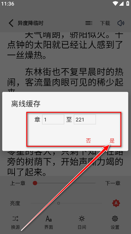 4.输入我们想要离线缓存的起始章节和最终章节,然后点击是。
