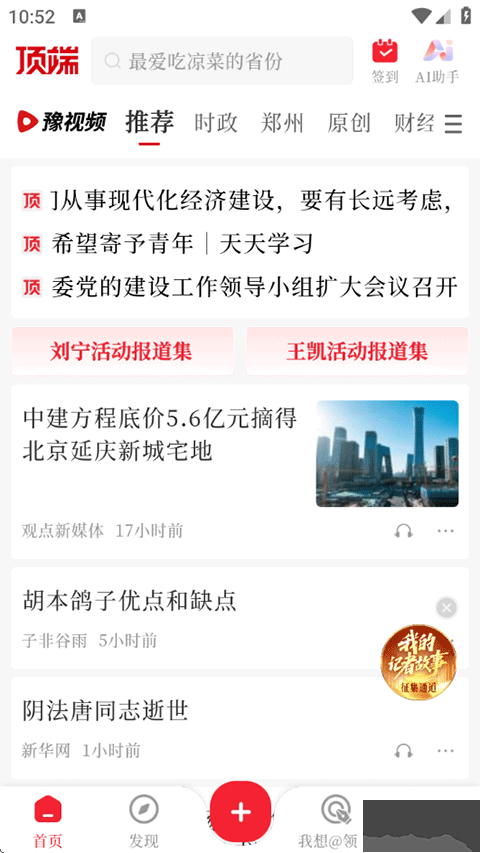 顶端新闻app是一款汇集优质新闻资讯的软件,先进技术为驱动,为新主流人群提供个性化、年轻态、问答式、视频性的资讯、政务还有本地生活服务。软件可以方便而且快速地获取各类社会新闻动态;还对资讯进行分类整理,涵盖郑州、时政、经济、短视频、直播等板块,切换查看十分便捷。支持24小时不间断更新,海量本地资讯随时获取。需要的朋友快来下载试试吧!