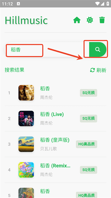 搜索音乐:在【发现音乐】内输入关键词搜索音乐,列表展示匹配的音乐资源,标注歌手、音质(SQ无损/高清)等信息