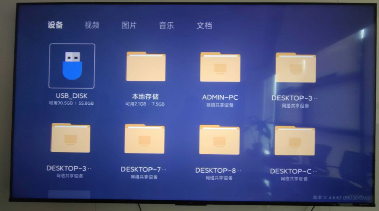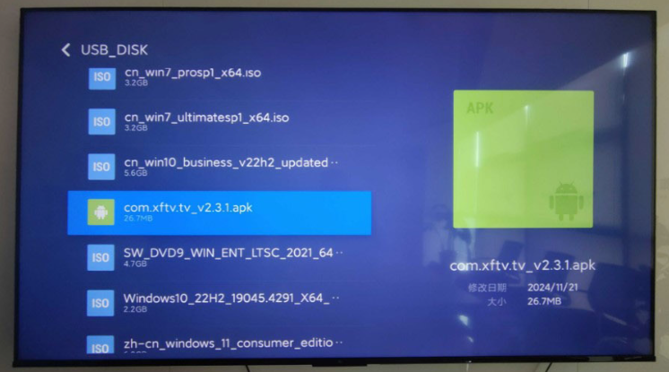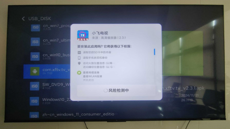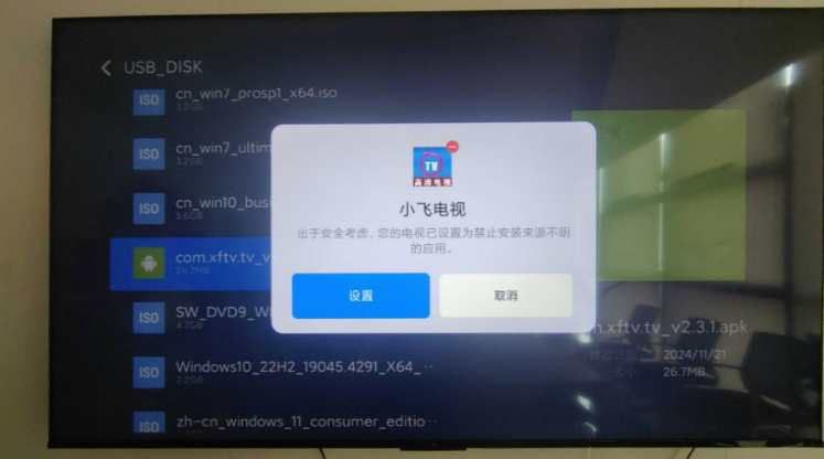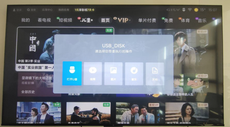 2、将下载好的小飞电视安装包的U盘插入到电视的USB接口上,会提示检测到新的USB设备打开