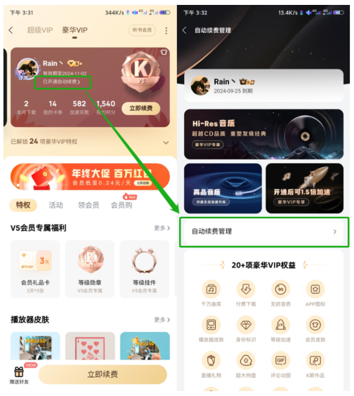 1、酷狗客户端:会员中心→超级VIP/豪华VIP→已开通自动续费→自动续费管理→关闭续费;
