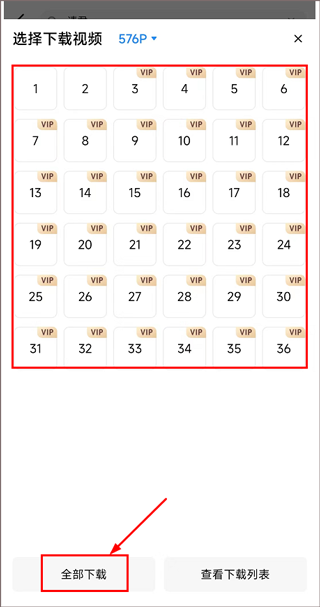 3、勾选需要下载缓存的剧集,或是点击【全部下载】