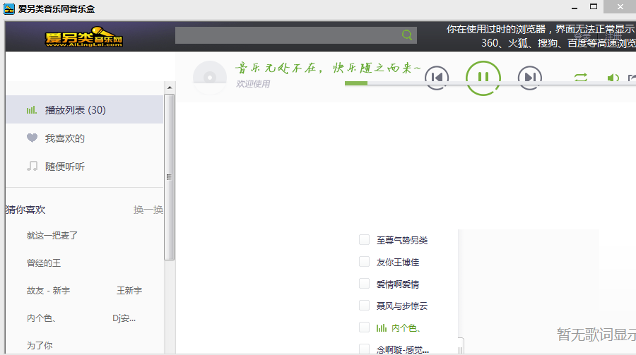 爱另类音乐网音乐盒是一款针对爱另类音乐网所推出的一个随机自动播放爱另类音乐网歌曲的软件。内含各大另类音乐人的最新另类喊麦作品,全自动播放另类喊麦音乐。有了这款爱另类喊麦音乐盒,用户可随意进行播放各种喊麦音乐。