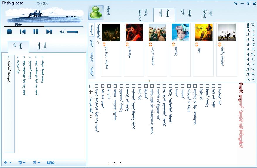 蒙古文播放器ehshig已经开始公测,有很多蒙古歌曲,可以分享歌曲以及感想..这里有几千首蒙文歌曲,有桌面歌词;有同步歌词;可以登陆注册;可以编辑歌词;可以听本地歌曲网络歌曲等等。