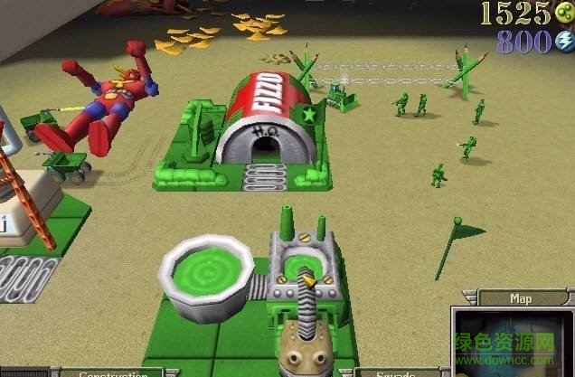 建议玩家在进入游戏前,先进行训练模式,更确切的名称应该是“新兵训练营”。显然游戏面向的并非是有丰富游戏经验的即时战略玩家,而是更喜爱异想天开的低龄玩家,这也是游戏会在PC和PS2平台上同步推出的合理解释。《即时战略版》的游戏界面是标准的即时战略界面,实在是简单得不能再简单了。一辆推土机就能建造任何建筑设施,从总部开始,可以逐步建造资源仓库、兵营、防御塔……只要是接触过《魔兽争霸》或《命令与征服》的玩家,都能够想象这个游戏的所有那些建筑设施。游戏中的资源不是传统的黄金、石油、食品、矿产,而是玩具兵最最需要的塑料和电池能量,而这些资源在人们的日常生活中是随处可见的。因而玩家不必为资源匮乏而烦恼,而且资源的收集是自动的,玩家只要专注于战斗就行了。最有趣的是,牺牲的玩具兵会软化成一堆塑料,同样是可利用的资源,这些塑料被收集起来又能重新生产出新的玩具兵。这种资源循环利用的概念,虽然