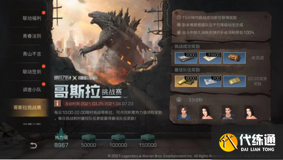在哥斯拉挑战赛中组队在15分钟挑战成功 可以获得奖励。战斗中耐久消耗和弹药补给消耗降低100%