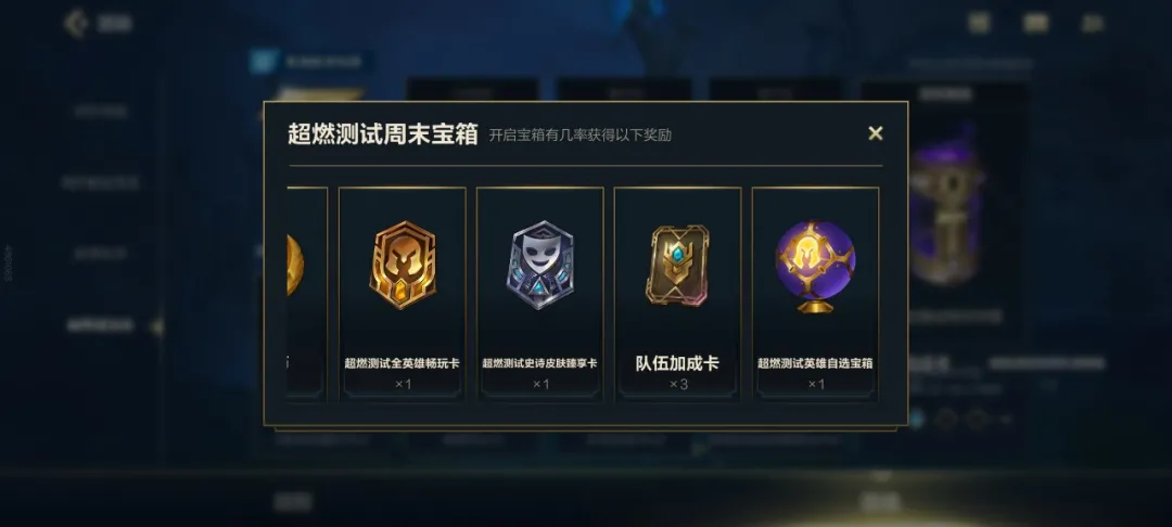 (开启宝箱,随机获得:蓝色精粹*95、魄罗币*30、超燃测试全英雄畅玩卡*1 、超燃测试皮肤体验卡*1、队伍加成卡*3、英雄自选法球*1)