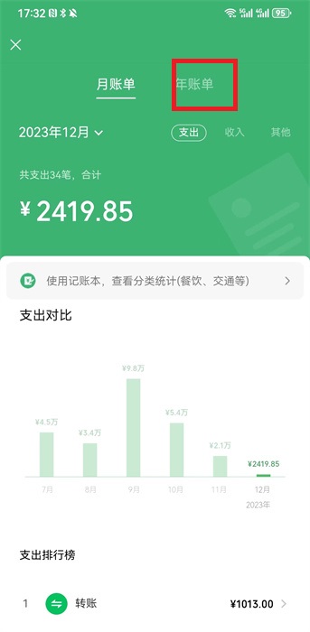 6、统计功能中可以看到【月账单】【年账单】,我们需要点击年账单进行查看;