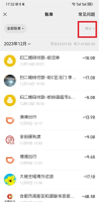 5、在账单界面,可以看到上方会有一个【统计】功能,如下图红框所圈位置;