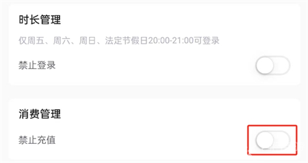 7、最后在该功能界面就可以看到【消费管理】,点击打开按钮即可禁止充值。