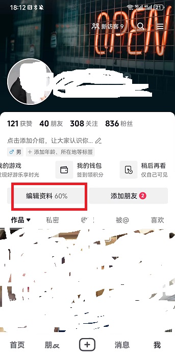 2、在这个个人界面中,点击中间的【编辑资料】,就可以去编辑自己的账号信息内容;