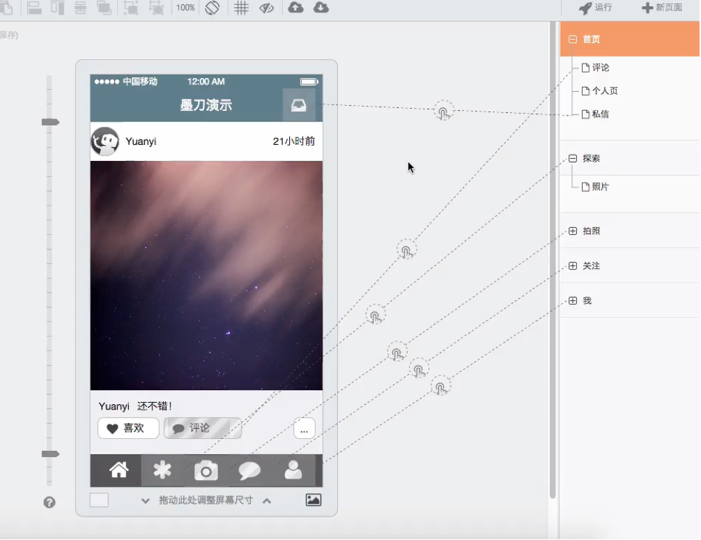使用墨刀可以非常方便的创建页面间链接,墨刀独创的拖拽链接方式,让页面间的链接关系清晰呈现眼前,要创建页面间链接,只需要选中要链接的组件,然后拖动组件右侧的小圆圈到目标页面就可以了,如下图: