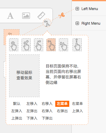 然后分别将两个手势组件与两侧的菜单相连,下面以左滑菜单为例,创建好连接之后,我们需要将手势设定为左滑动,然后选择“左菜单”作为页面切换效果,见下图: