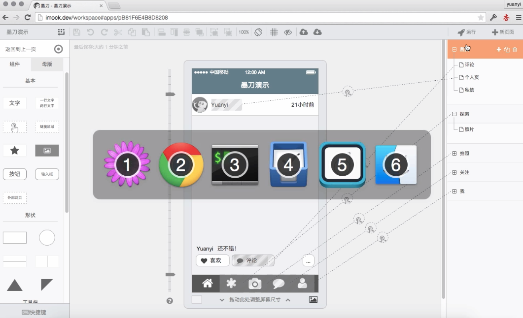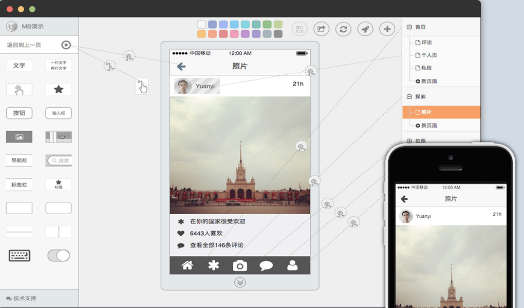 墨刀Mac版是一款在Mac平台上的手机app原型设计工具,是一个免费的移动应用原型与线框图工具。墨刀MockingBot旨在帮助产品经理及UI/UX设计师快速构建移动应用产品原型,并及时与团队内其他成员分享和讨论。作为一款专注移动应用的原型工具,除了云端保存,实时手机预览,MockingBot还有多种手势,页面切换特效及主题可供选择。