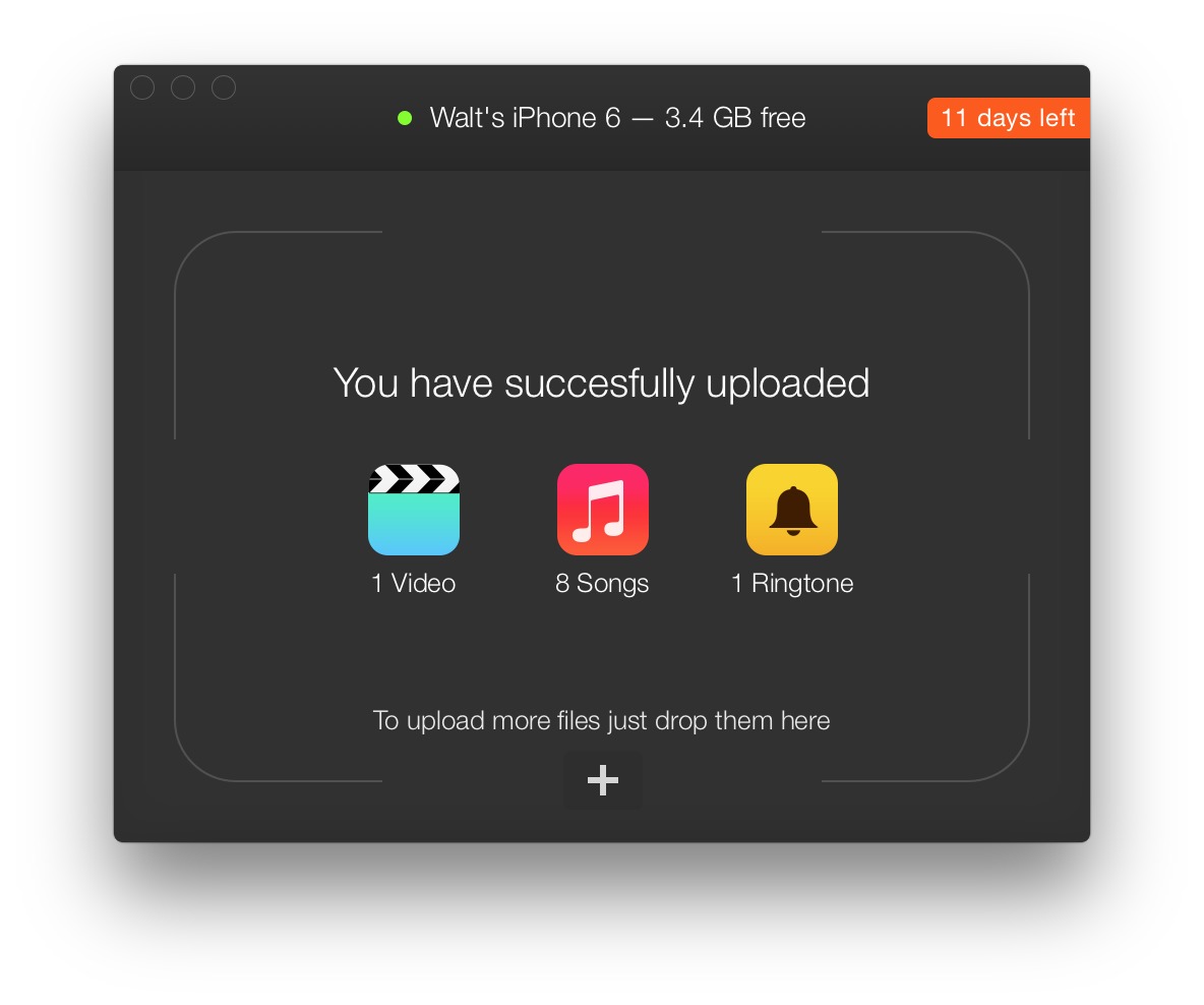 传输媒体文件,只需要几个步骤。这里是WALTR如何让你的下巴滴:你启动应用程序,连接设备,拖动视频或音频到它,它会自动启动上传到你的iPad或iPhone。就是这样!