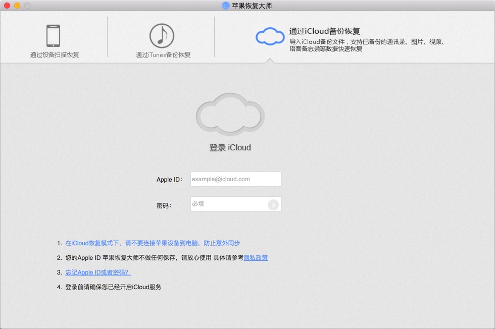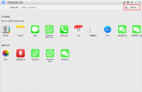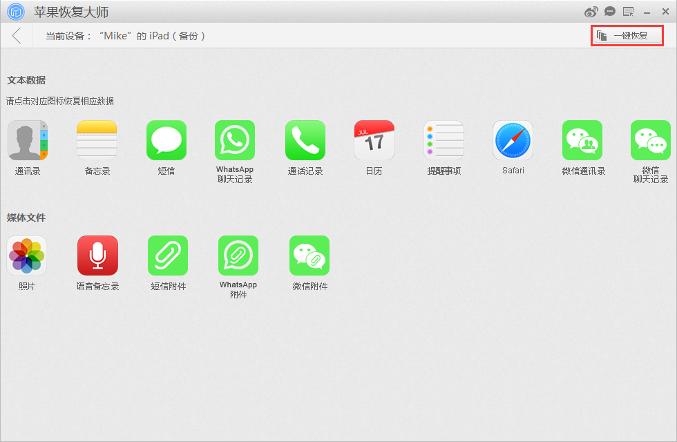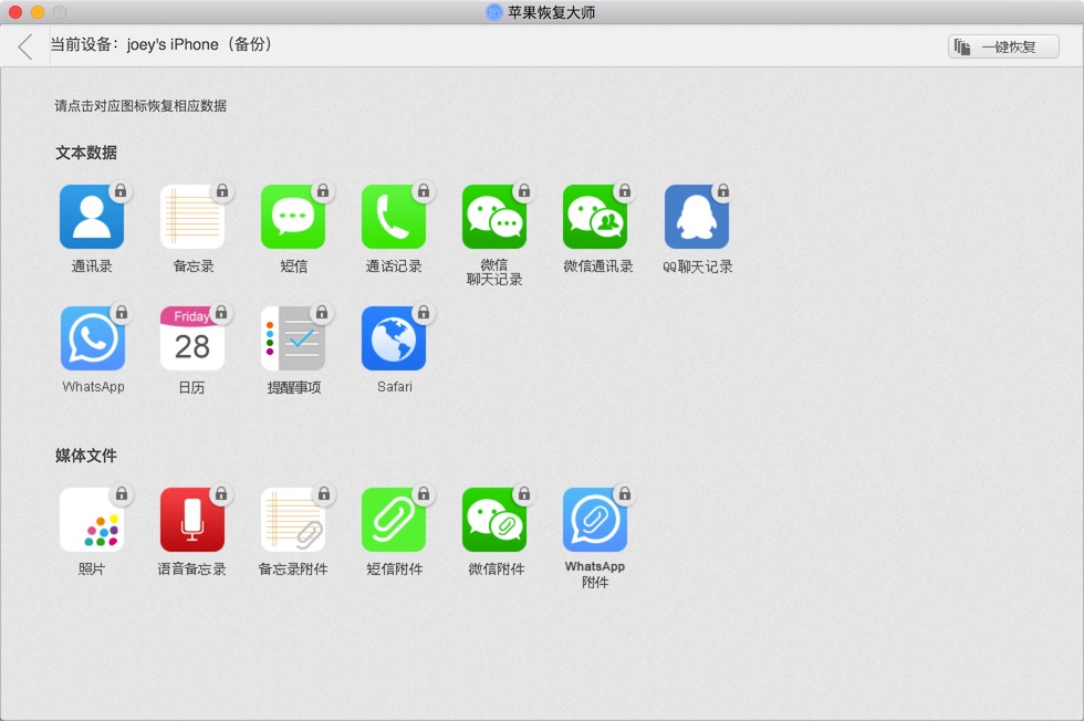 苹果恢复大师完全免费使用,支持通讯录、短信、备忘录、日历、safari、照片以及微信通讯录、微信聊天记录等数据,可通过itunes或icloud恢复。