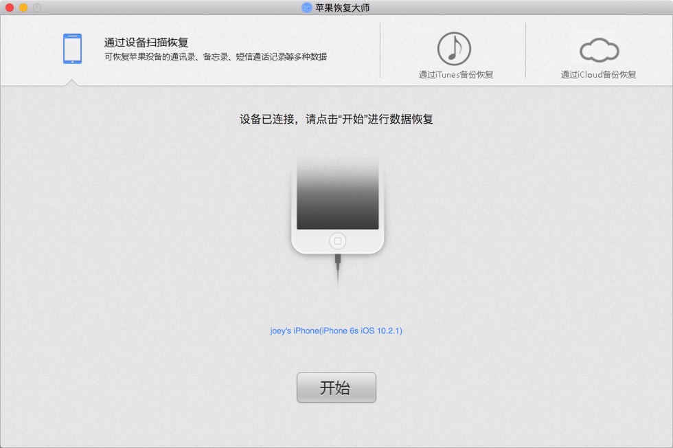 第一步,打开苹果恢复大师,连接设备至电脑,点击【开始】。