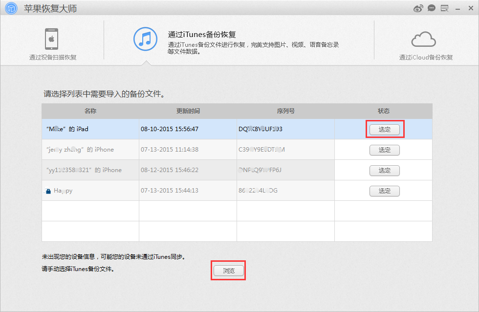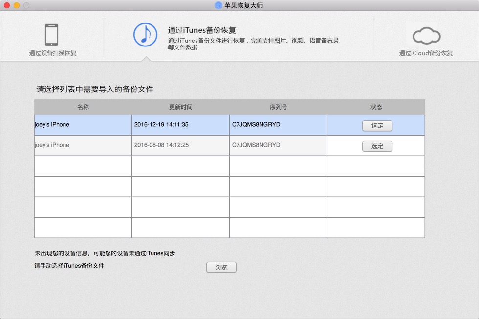 第二步:选择想要恢复的备份文件,点击【选定】。若未出现设备信息,可点击下方的【浏览】手动选择 iTunes 备份文件。