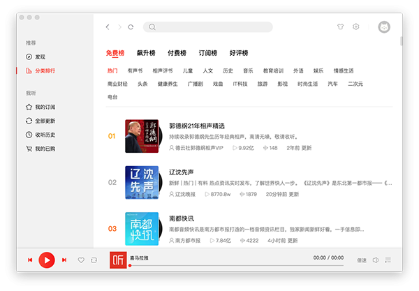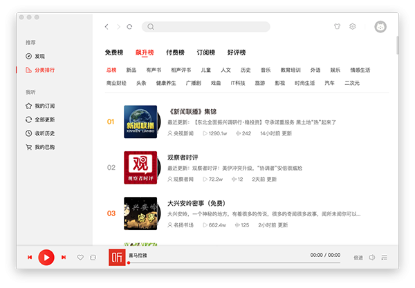 喜马拉雅MAC版,喜马拉雅FM官方发布,特为苹果电脑用户们打造,让听电台、听书、听相声、听广播剧都变得轻松方便许多,喜欢的话还能下载到您的电脑内,并支持多端协同,收藏的内容会同步到其它的设备上哦!