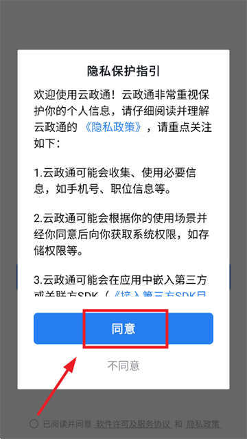 在本站下载安装并打开云政通app,先同意隐私保护指引
