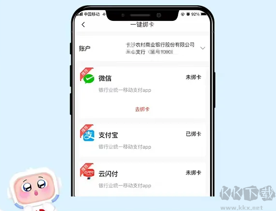 2、点击“一键绑卡”查看默认账户与第三方平台的签约状态。点击“账户”可切换账户并查看各账户的签约情况