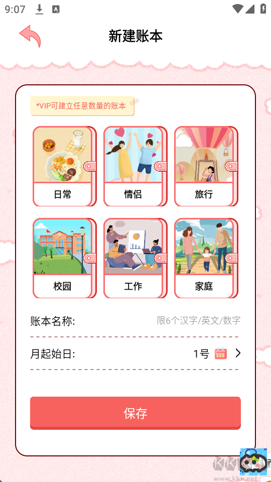 2、为不同人群设计多种账本类型,类别贴近实际消费场景,记账时选项清晰,也支持自定义类别