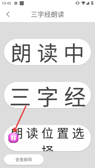 3、朗读开始后,可在界面查看朗读状态,也可点击暂停按钮控制播放,还能选择查看解释辅助学习。