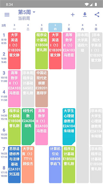 4、课程区分清晰:不同课程可设置不同颜色,直观区分各类课程,从视觉上快速识别课程类型,适配课程繁多时的高效管理需求。