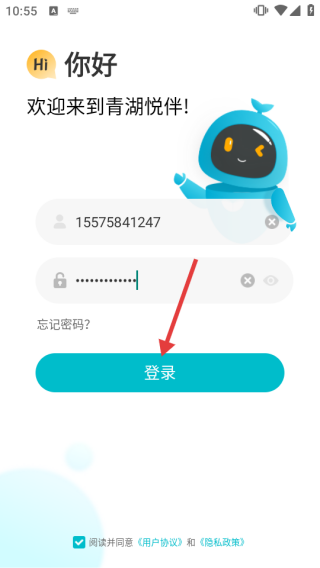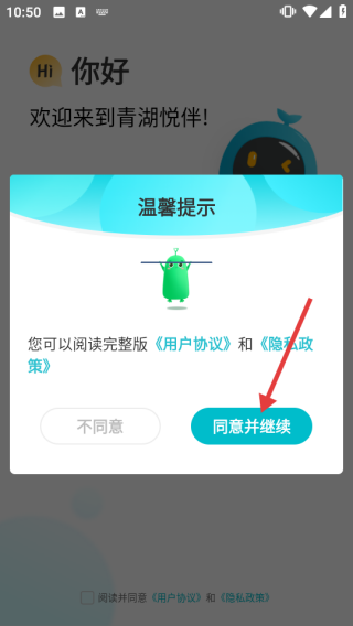 1、打开“青湖悦伴”APP,在温馨提示弹窗点击【同意并继续】。