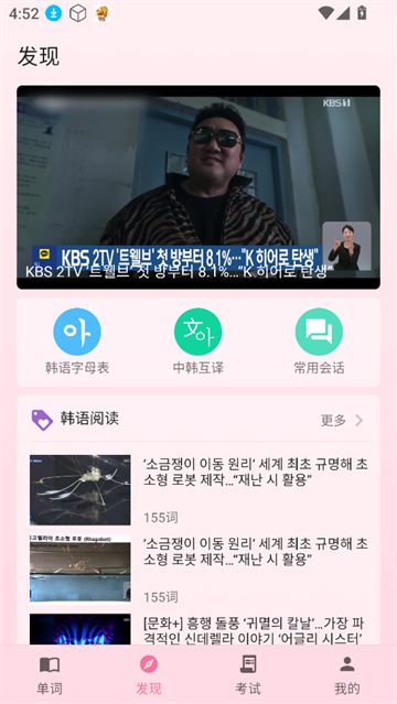 3、发现页可以学习韩语字母表,进行中韩互译等操作,还能阅读韩语文章。