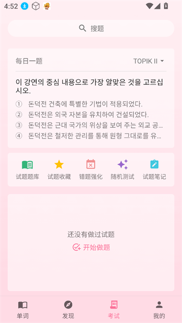【韩语TOPIK考试】模拟真实TOPIK考试,每日一题、错题强化、随机测试和试题笔记等功能,让考试更从容。